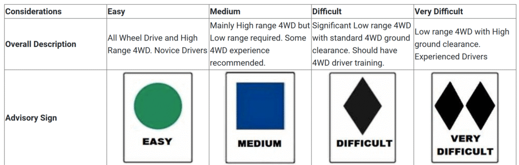 Most 4WD trips involve a variety of track conditions, each falling within a specific rating on the scale. Trip Leaders should inform participants of the expected range of track grades likely to be encountered on the planned route.